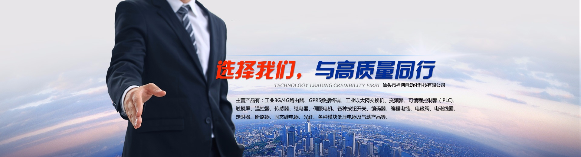 汕頭市福創(chuàng)自動化科技有限公司是一家集自動化元件的代理銷售與維修、自動化設備設計制造、自動化工程安裝改造、機電工程安裝改造、自動化機械設備設計與制造的企業(yè)。 主營產(chǎn)品有:工業(yè)3G/4G路由器、GPRS數(shù)據(jù)終端、工業(yè)以太網(wǎng)交換機、變頻器、可編程控制器(PLC)、觸摸屏、溫控器、傳感器、繼電器、伺服電機、各種按鈕開關(guān)、編碼器、編程電纜、電磁閥、電磁線圈、定時器、斷路器、固態(tài)繼電器、光纖、各種模塊低壓電器及氣動產(chǎn)品等。